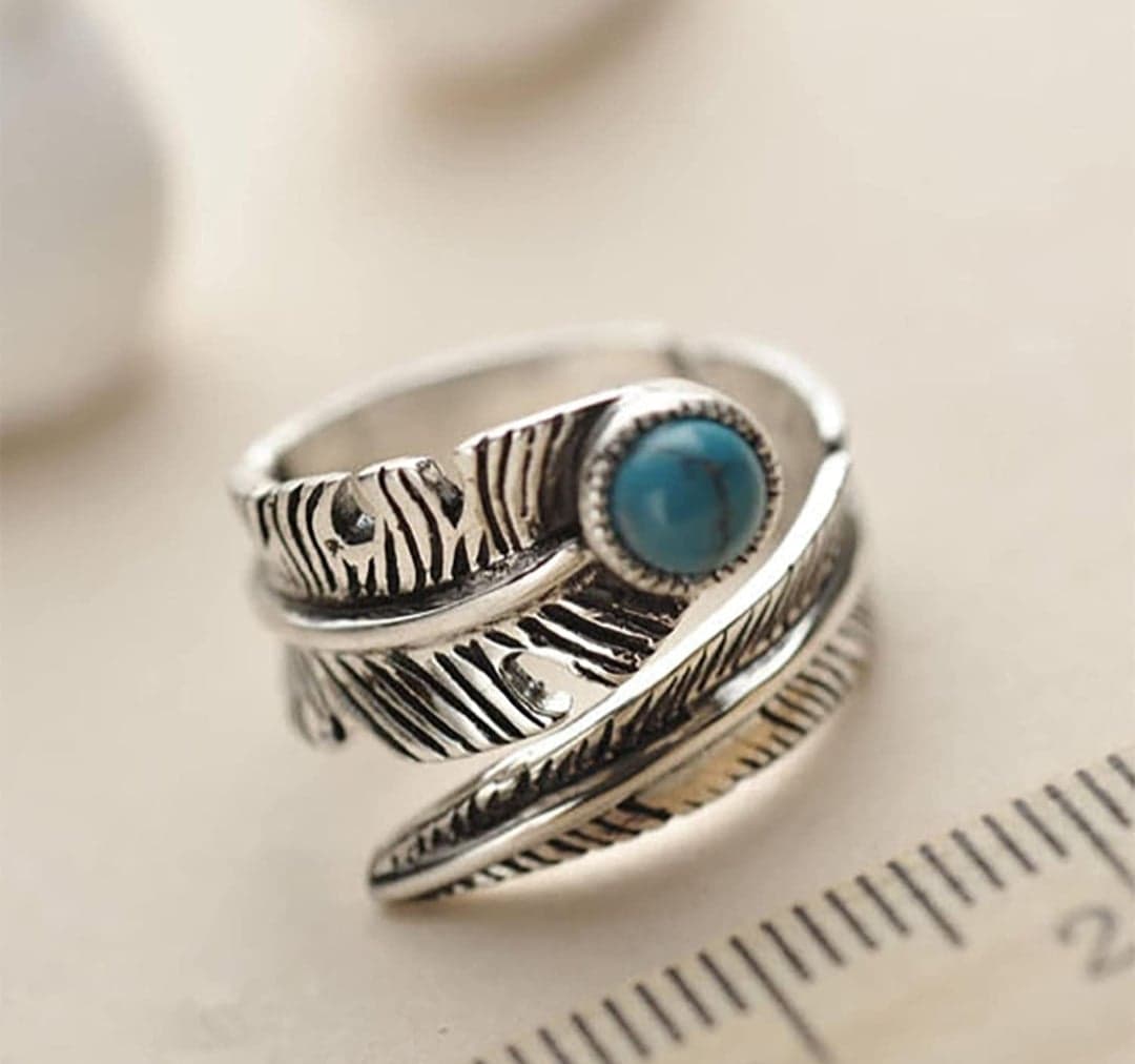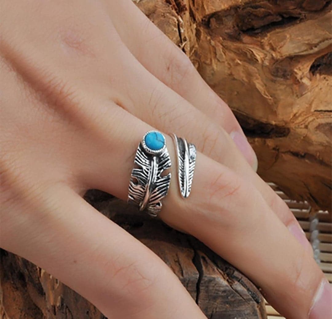 Bagues plaquées Argent 925 pour Femmes Bague en Plumes Vintage avec bagues d'ouverture réglables Turquoise synthétique Cadeau de Bijoux
