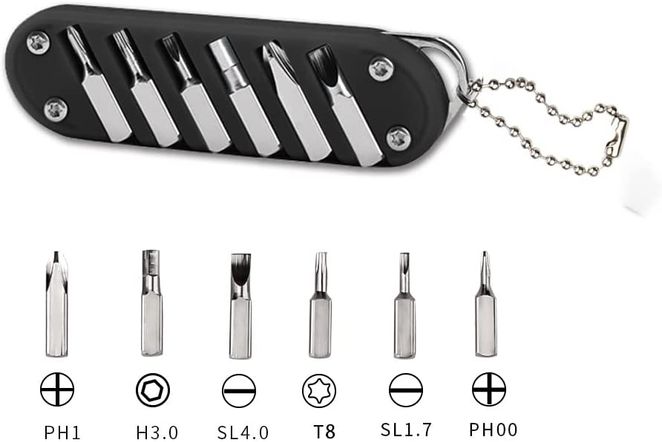 Tournevis Avec 6 Embouts, PH1, PH00, H3.0, SL4.0, T8, SL1.7, Tête magnétique pour un maintien efficace et un changement rapide de l’embout.
