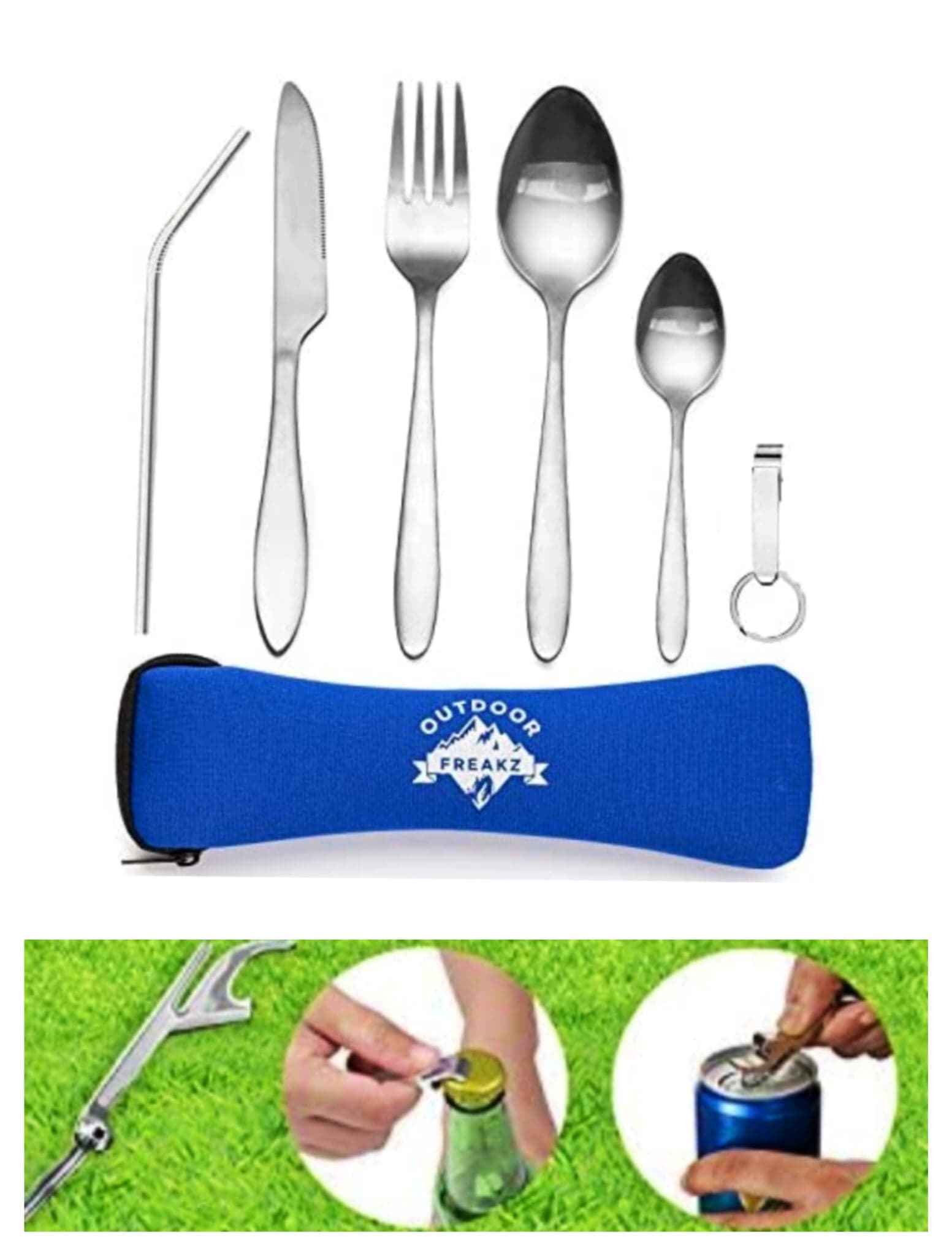 COUVERTS DE CAMPING – Conçus pour tous les fans de plein air qui aiment les outils sans défaut! Réduit aux objets strictement essentiels: cuillère, cuillère à café, couteau, fourchette et ouvre bouteille dans un sac en néoprène résistant aux intempéries!