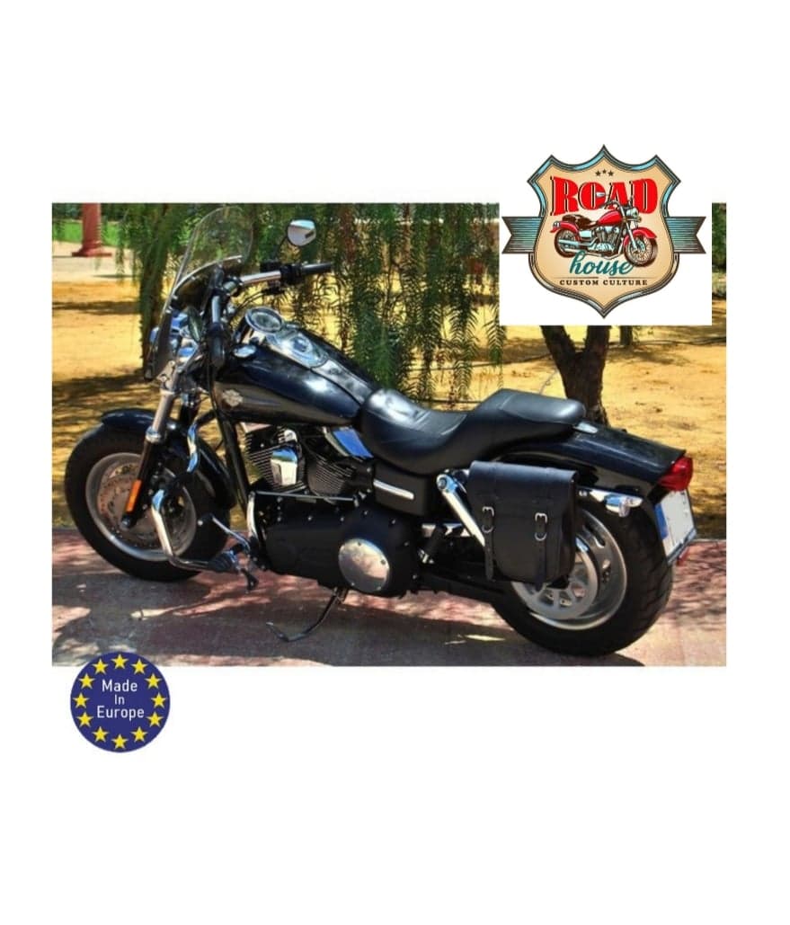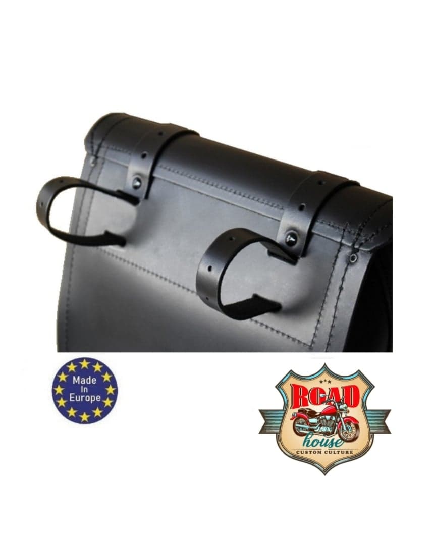 - Fixation arrière par sangles cuir ajustables pouvant se fixer directement sur les sabres de la moto.